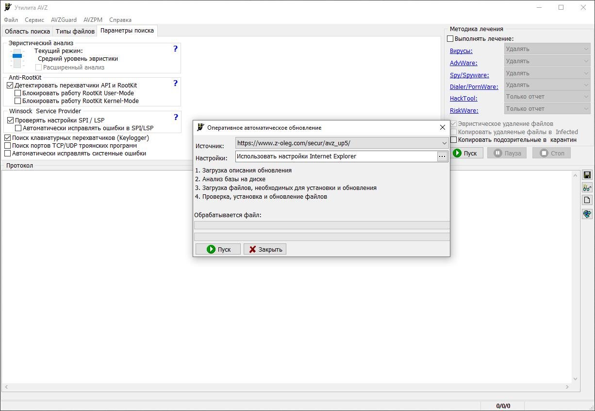 • Эвристическое удаление файлов. Суть его состоит в том, что если в ходе лечения удалялись вредоносные файлы и включена эта опция, то производится автоматическое исследование системы, охватывающее классы, BHO, расширения IE и Explorer, все доступные AVZ виды автозапуска, Winlogon, SPI/LSP и т.п. Все найденные ссылки на удаленный файл автоматически вычищаются с занесением в протокол информации о том, что конкретно и где было вычищено. Для этой чистки активно применяется движок микропрограмм лечения системы;