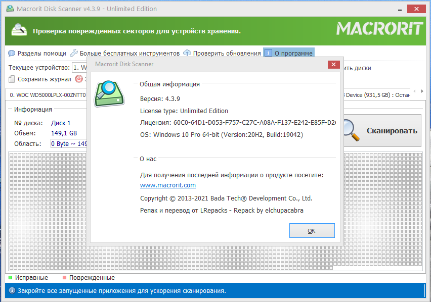 Не требуется (инсталлятор уже пролечен)Macrorit Disk Scanner - инструмент для проверки жесткого диска и выявления на нем битых секторов. Такой тест полезен для оценки качества вашего винчестера, т.к. чем больше поврежденных секторов, тем больше вероятность того, что данные на диске могут потеряны.Macrorit Disk Scanner позволяет протестировать жесткий диск, показывая хорошие и порченные сектора. Тем самым вы сможете принять решение о необходимости замены своего накопителя информации. Просто выберите диск и запустите сканирование. При необходимости можно указать определенный диапазон секторов, если интересует анализ какого-то конкретного промежутка.